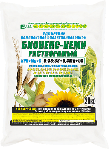 Комплексное макро-, мезо- и микропитание всех сельскохозяйственных культур в виде внекорневых подкормок c высоким содержанием фосфора и калия.